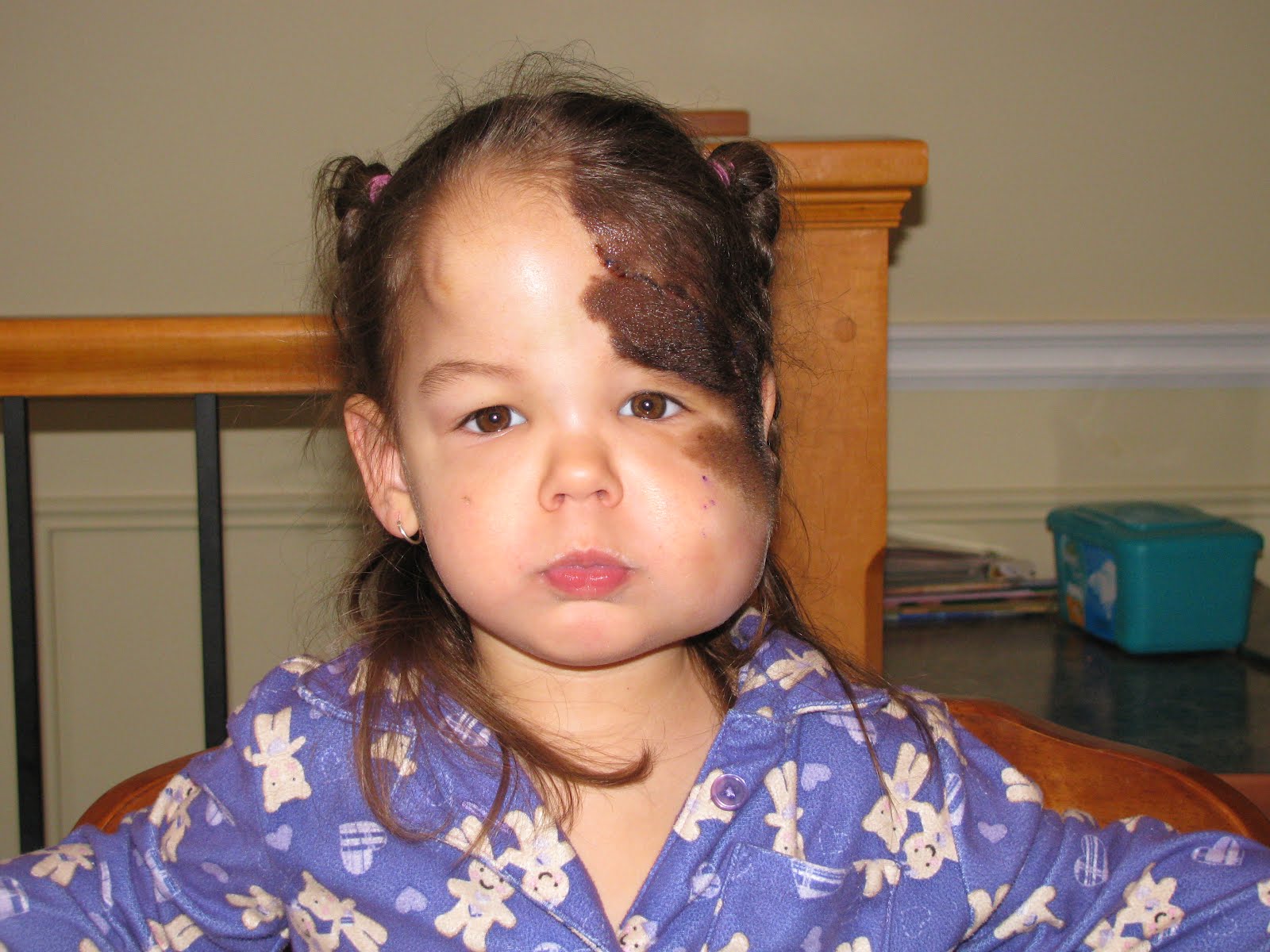 This was taken today. The forehead expander is popping out and it looks like she's has a good-sized goose egg.