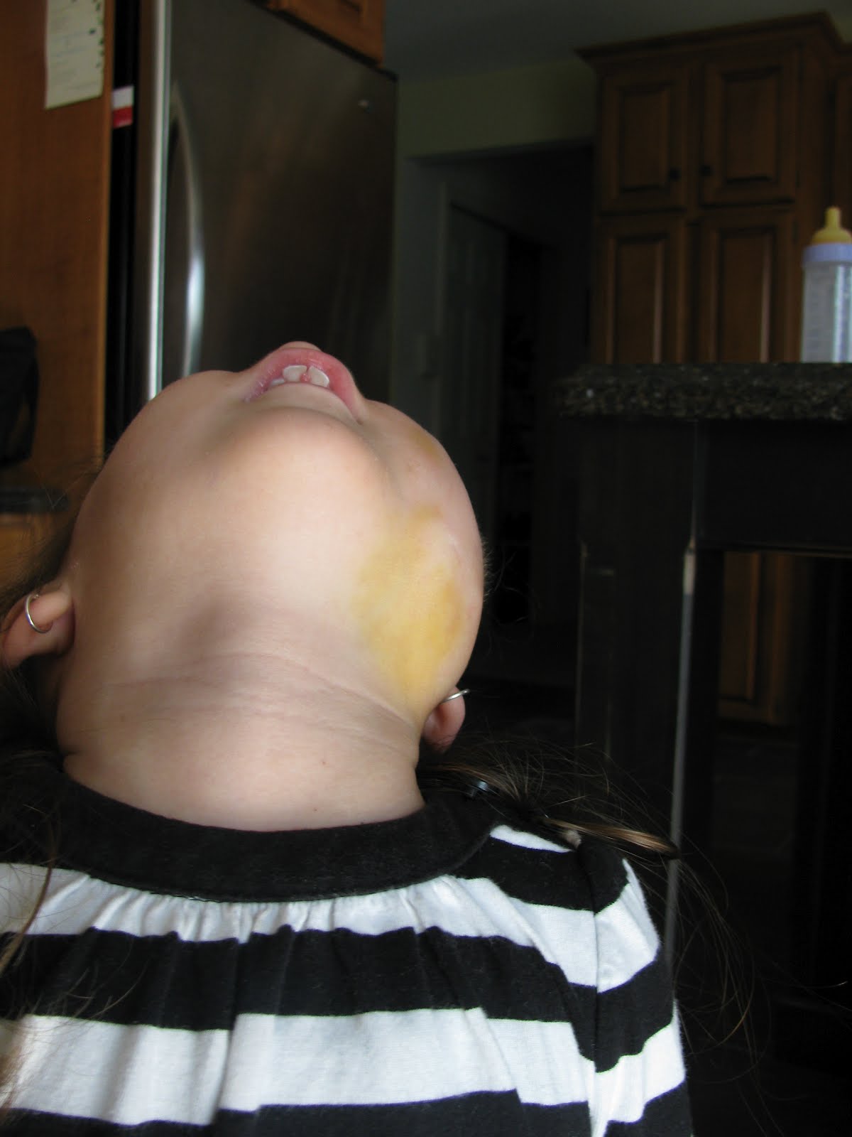 Sunday she woke up with her eyes almost swollen shut and yellow bruising around them, and on her forehead. She was quite the sight! But it didn't stop her! And she didn't seem to be in any pain.