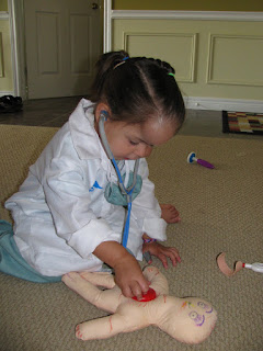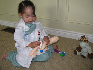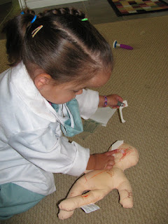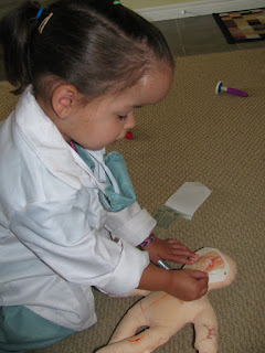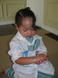 And so today, with Patches and Kez dressed in their doctor outfits, they set out to help the baby that needed lotion and bandaids. We worked with saran wrap again to keep the lotion in place. I was able to put the lotion on her "owies" as well as saran wrap, so hopefully she'll let me tomorrow. The difference I noticed today was that if I used the word "cream", she became anxious. If I used the word "lotion", she was okay with that.