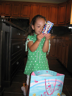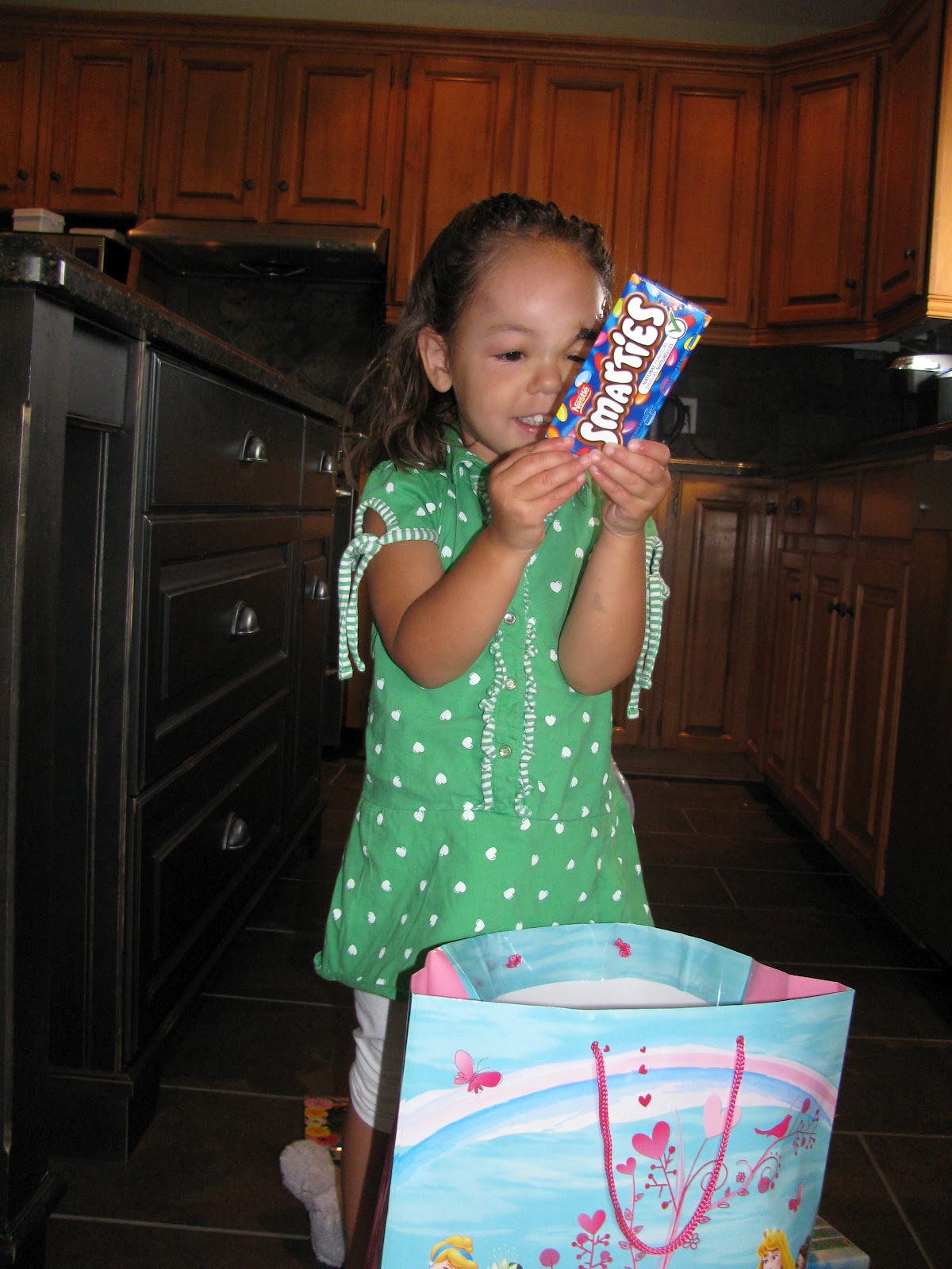 Spoiled, I tell you!! This girl has received SO many gifts in the last three months! Here she is with a very large gift bag packed full with all kinds of stickers, books, colouring books, crayons, etc.etc. all from Nathan's employees. What generosity!!