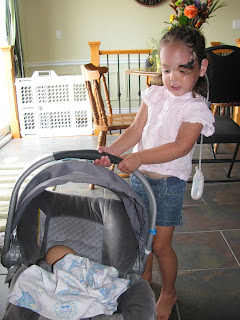 And you can tell what she's been through by just watching her play. Below she has her baby in Lincoln's carseat and is on her way to Aunt Karen's house (where Lincoln was while she was the hospital). The picture underneath that one, she is laying in bed with her baby at the "hosible".