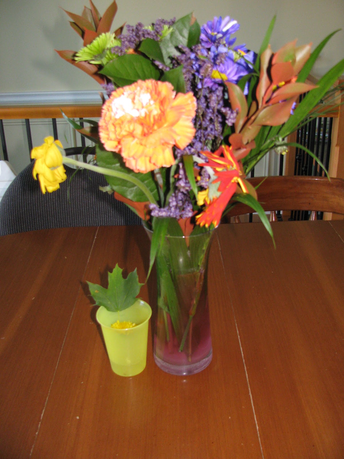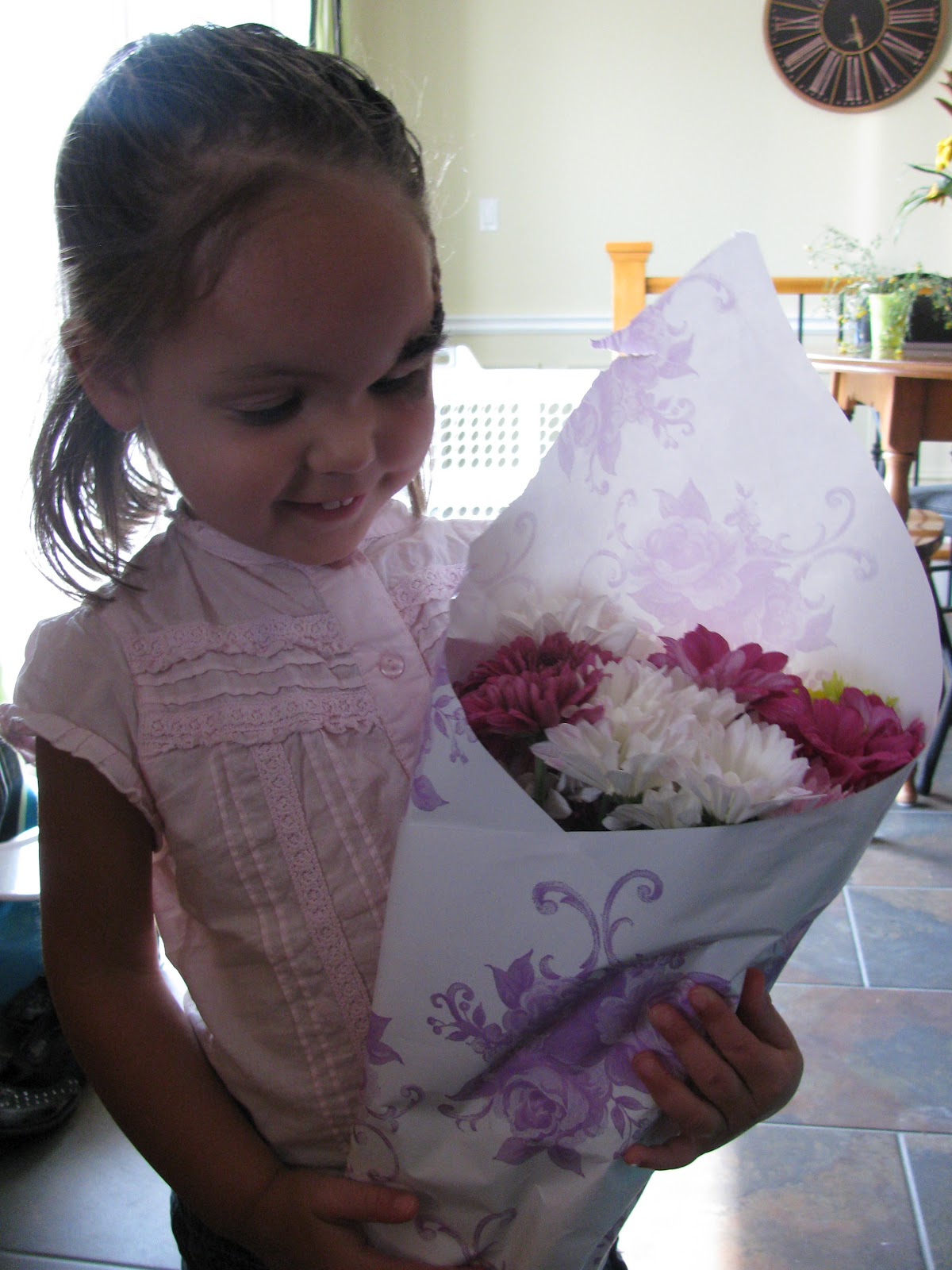 She was SO thrilled!! You see, Nathan had come home with flowers for me the other day. Seeing that, she went out in the backyard and also picked me some flowers.