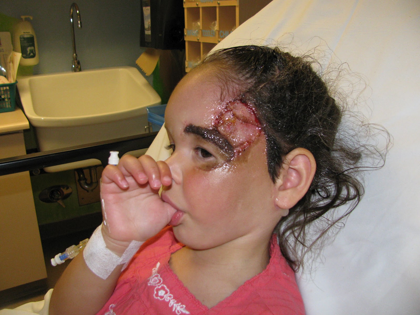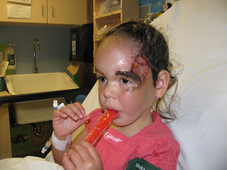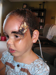 And the good news just keeps rolling in!! This morning, after having a fit in her daddy's arms, Keziah snored like a baby for about 1/2 an hour, the time needed to remove the drain and gauze from her. And the result? A very nice looking skin graft! Dr. Zuker was very pleased with how it looks and so are we. Now remember, when you look at the pictures, it is still a little raw looking, but over time, the incisions will heal up and the scars will fade. But we are so thankful for how it looks today. Often when dealing with skin grafts, the grafted part is a different colour, and even texture, than the skin surrounding it. However with her skin grafts, the skin colour pretty well matches with the rest!! We are thrilled! So here are some pictures. Again, just a reminder to you faint-hearted. There is blood and stuff so, well, don't look too close :o)