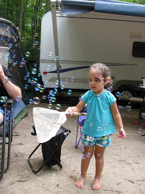 Having two kids now, we have thoroughly enjoyed our purchase. There was at one time in our camping week that I took pictures of our site as I chuckled in how different our site looked a few years ago. My. We have gone from a tent, clothes line with two bathing suits and towels and two bikes to a campsite cluttered with a trailer, bikes, bike trailer, play yard, high chair, sand toys, play toys, crocs, a clothesline filled with clothes that are sized 3 and under, life jackets, pack and play and a little bitty lawn chair that is purple. Ahhh, I love that type of clutter! :o)