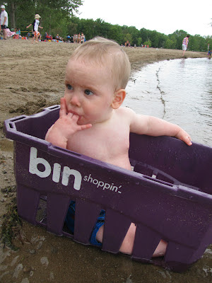 Lincoln had no problems with sitting or standing in the water. He loved it! I, on the other hand, was tired of trying to keep every stick, sand and stone from entering his mouth. So in the bucket he went. He liked it at first but it didn't last too long!