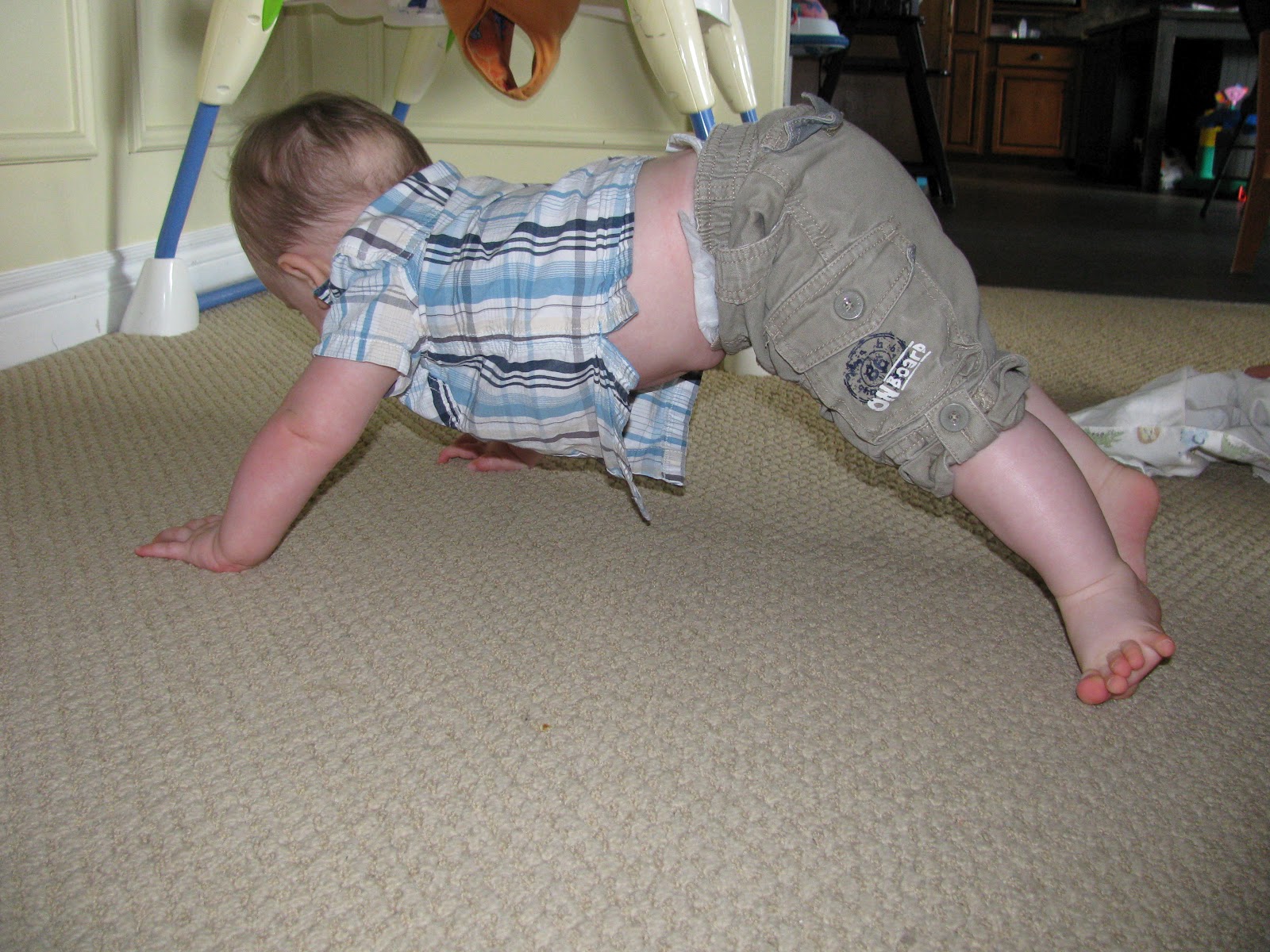 It has been awhile again, since I've written about Lincoln. This boy keeps growing and changing overnight!!! It has been a fun few weeks as we've been watching him learn to crawl. I know a child learning to crawl is not always looked at as a big deal, but I just can't help but be amazed when I see it all coming together. It is so fun to see that after learning a new stage, the next one develops. For example, a number of weeks ago, he learned to pull his legs up and under him, which had him rocking back and forth. After a few days of that, he learned to pull his legs up and then move one leg forward at a time, which resulted in plenty of faceplants as he hadn't figured out how to move his arms. Not giving up, he would pop back up into the rocking position and then tentatively lift up his right arm, moving it 5 mm forward, and then flop down. After doing that for awhile, he has now figured out how to move his left arm and now he is everywhere!! It's so funny because he wants to move fast and get places but the harder he tries, the more "out of control" he is! And then he gets frustrated! Ahhh, lots of fun!! Life is sure to be interesting now with a 7 month old going places! Dear Keziah has no idea what's ahead for her. I do believe their relationship will go through a rough patch now that he can get into her stuff! :o) The joys of siblings!