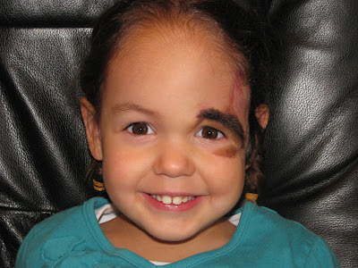 Over time though, we've realized that what is left above her eye also needs to go. Never have we been asked so much about her face as we do now!! I know, crazy eh?! But understandable. With just the birthmark, people stared, pointed and sometimes asked. With the birthmark and expanders, people didn't know where to look, how to speak or handle what they were seeing. But now? Daily we are asked (or she is asked) "What happened to your eyebrow?" or "Oh my, that is quite the owie!" or "Did you fall?" or "How did she manage to get such a black eye?". Everywhere we go, questions are posed at us. The difference from the questions that were asked before? All of these questions are asked in a very sincere and genuine tone. Every single one of them. That is so nice.