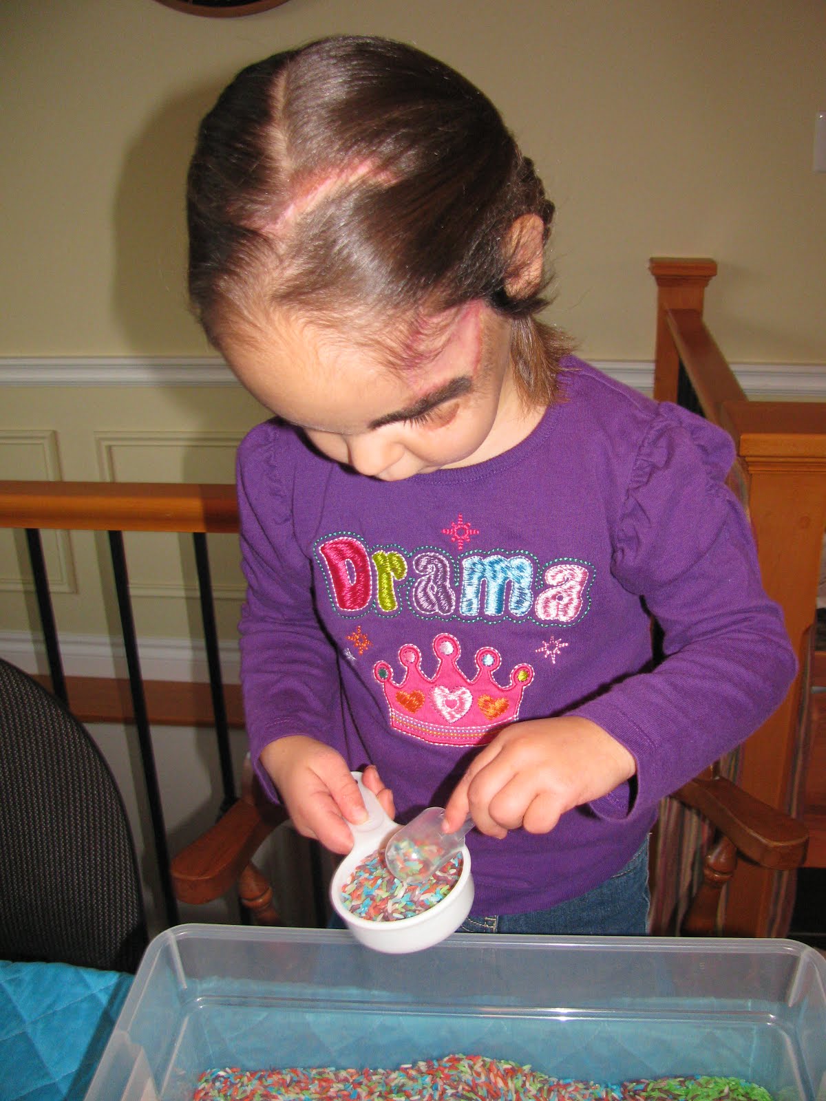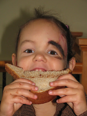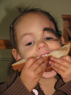 But here we are, 4 months later. Her healing continues to go very well without infections. The only complication that is developing is her droop. Now it is quite noticeable compared to a month and half ago. And it will continue to droop more and more as time goes on, until we meet Dr. Zuker in May, where he will deal with it as well as the rest of the birthmark on her face (which by the way is NOT face paint!!! Do you know how often she has been asked what is painted on her face???).