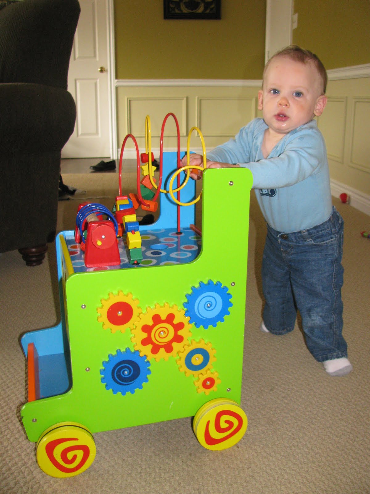 ....I bought this walking toy at a garage sale to give to Lincoln for Christmas, thinking he would need it then, not NOW?!