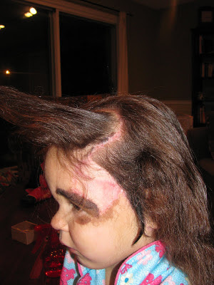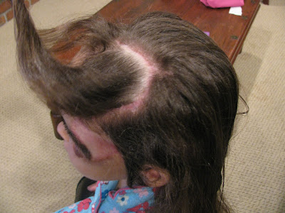 Most of her scars are not too pronounced except for the ones in her hair. She has quite the wide scar where there isn't any hair growing, which leaves it quite noticeable. The big wide scar is like a backwards "C", going from the top of her head, around and down to meet the top of her skin graft.
