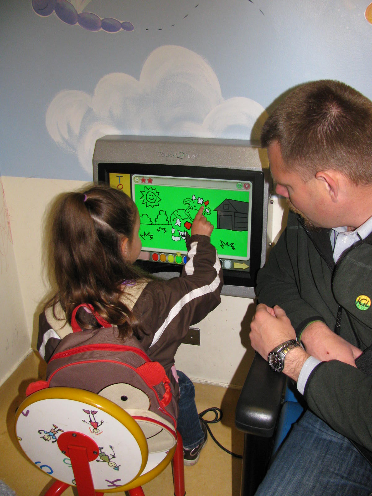 One of the things she was most excited to see were the fish in a tall cylinder-like aquarium. She was disappointed that they were not there (the fish are fake.....) but that disappointment didn't last long as she quickly saw the computer: