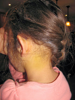 When she woke up in the recovery room, she right away complained of a very sore neck. Her neck bothered her for a few days afterwards, and it's no wonder. About 4 days later, this is what her neck looked like: