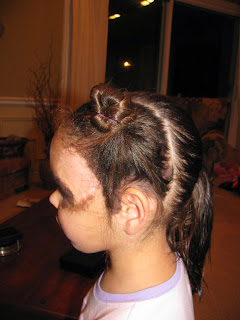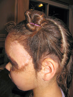 With her last removal, some of her scalp nevus was removed off the top. For the following pictures, I parted the hair along the edge of the birthmark on her scalp. All that you see on the inside of the part, all the way to her scar line along her hairline, is her scalp nevus.