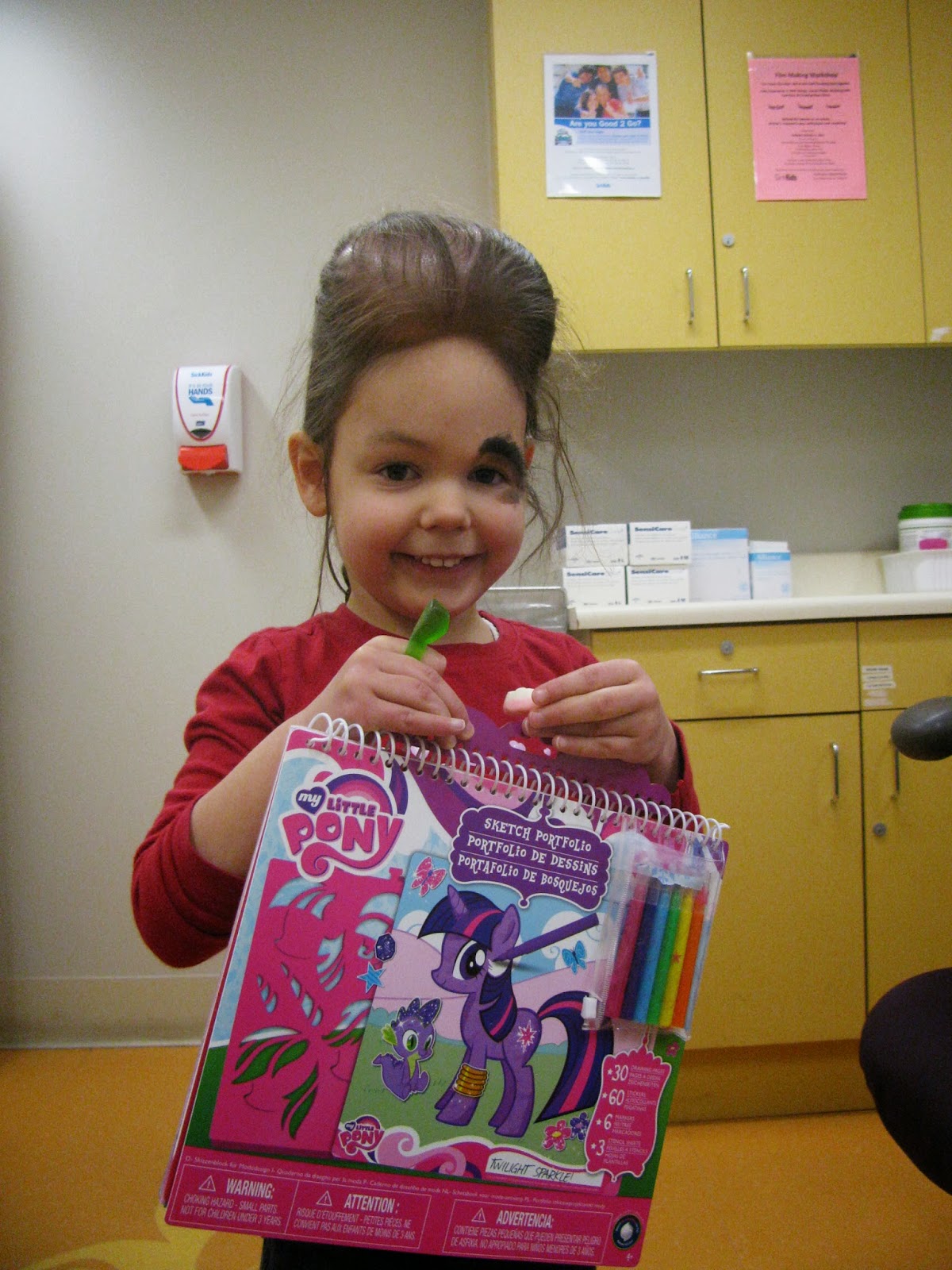 We've told her what is coming in 5 nights sleeping and so far she is very okay with it. The next time we drive to Toronto will be on Tuesday, to be there for 6 in the morning. Yawn. But we are soooo looking forward to getting this surgery done. Dr. Zuker figures she'll be under for 4 hours or so. Her last removal took 7 hours, so 4 hours is definitely doable - waiting wise. He mentioned that he also would like to remove a bit from under her eye and all by her temple. You can see what he means in the picture above where she is looking to the side. But he said it all depends on how badly she swells from the big removal of her scalp. As for the eyebrow and the rest around her eye, he figures next year, which will give what is done now plenty of time to heal. It all has to be healed and settled before we touch the eye or else distortion becomes a great risk.