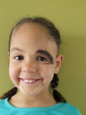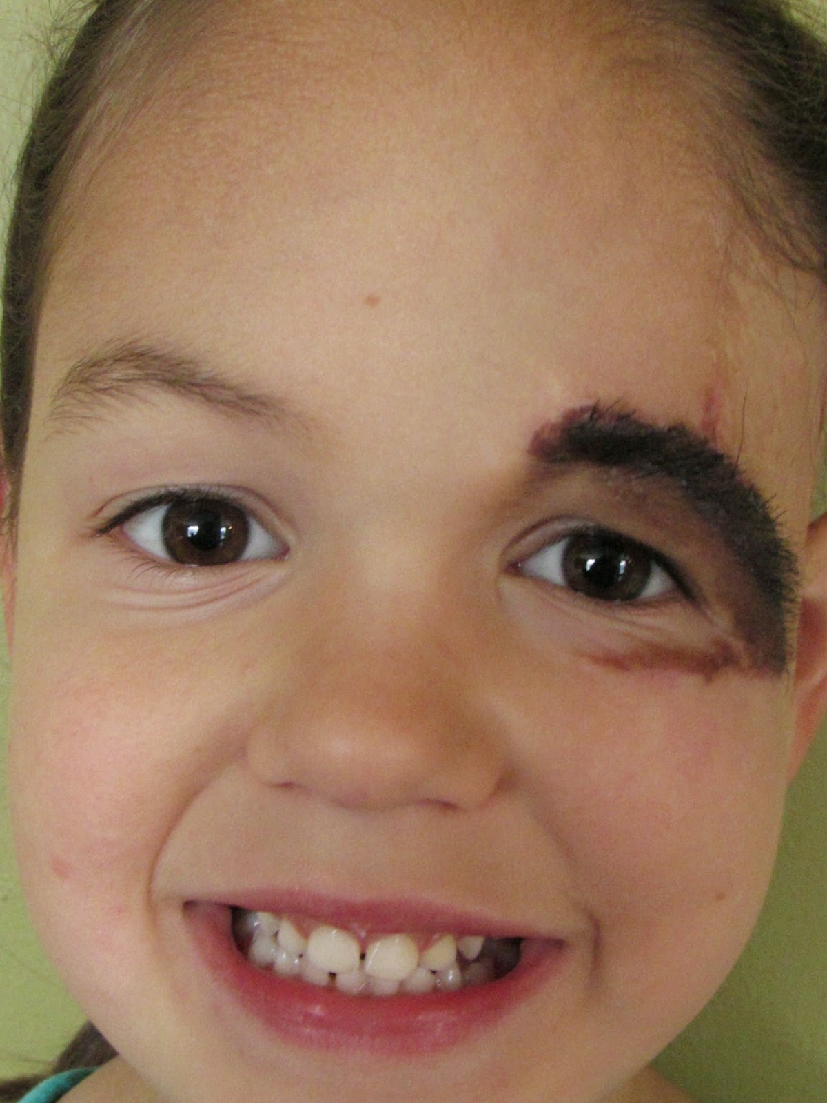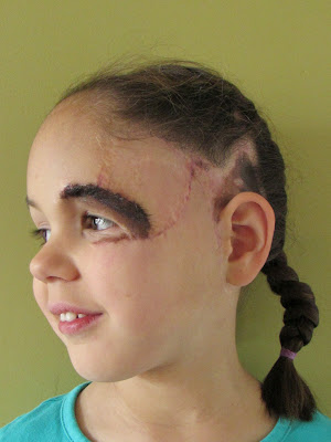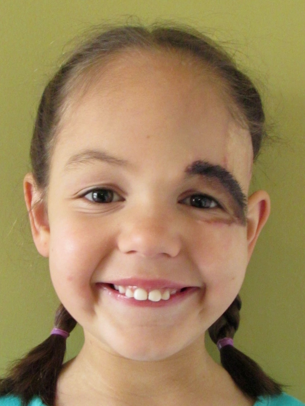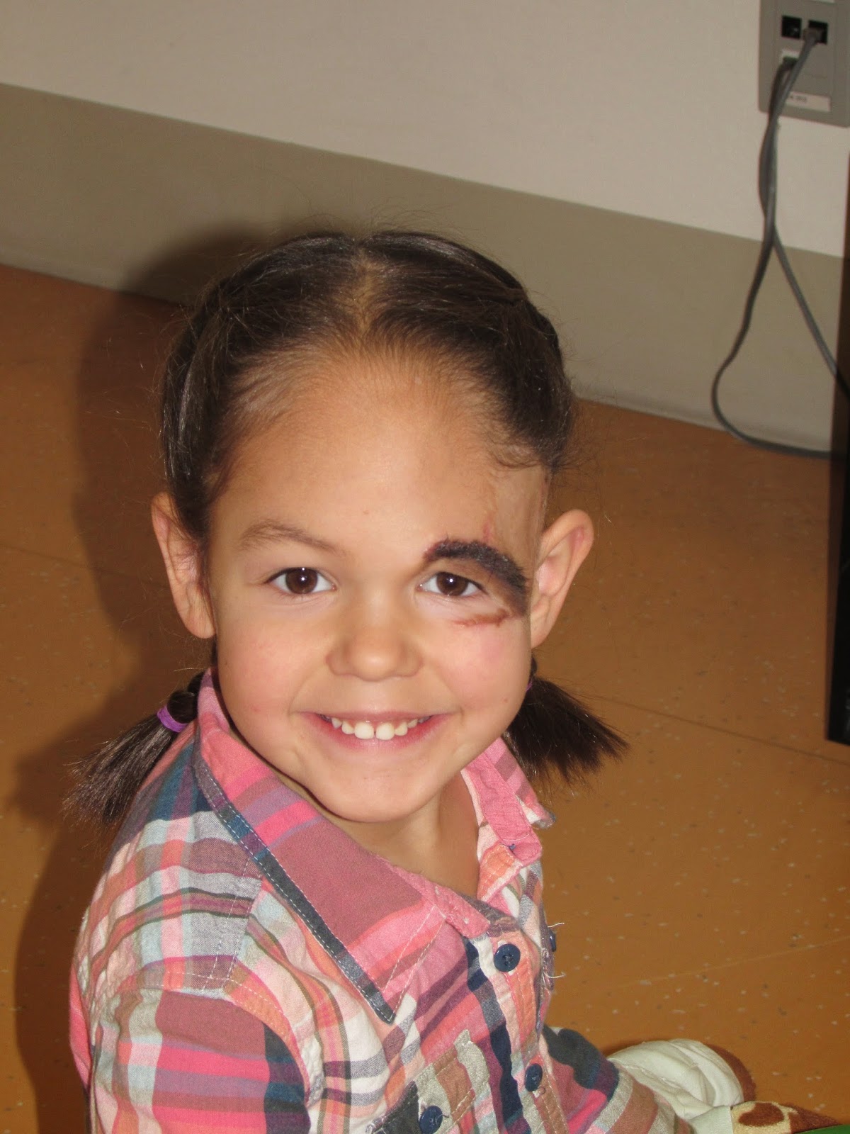 So, for next time, Dr. Zuker is planning a surgery for April of 2015. In this surgery, he will be using skin from the back of her ear to place along her eyebrow, where it is not as dark but still dark. He will also make the eyebrow really skinny and shorten it. He will get rid of what is left under her eye, and he will also fix the gap on her scalp, which is quite large and has no hair.