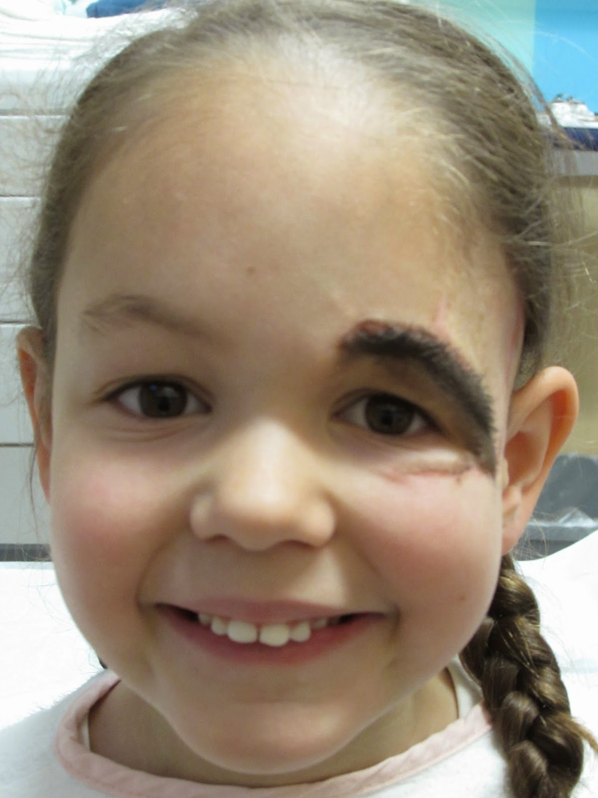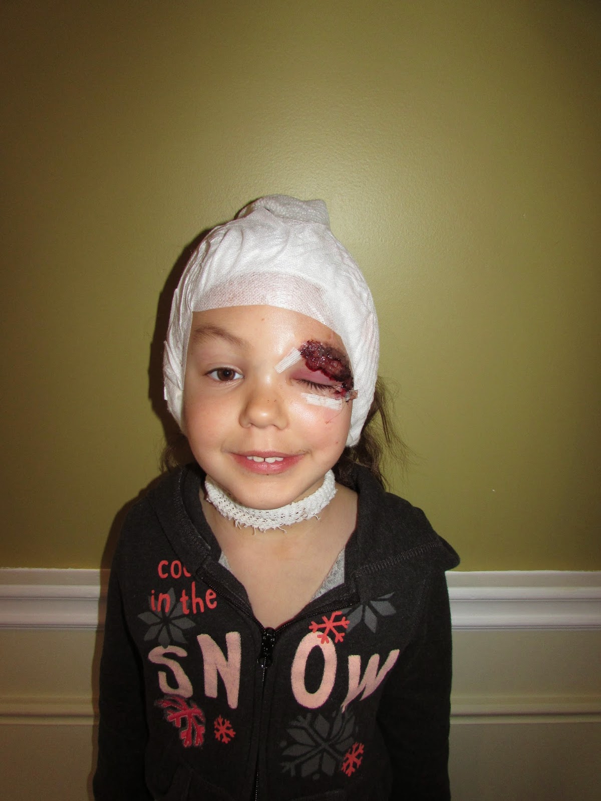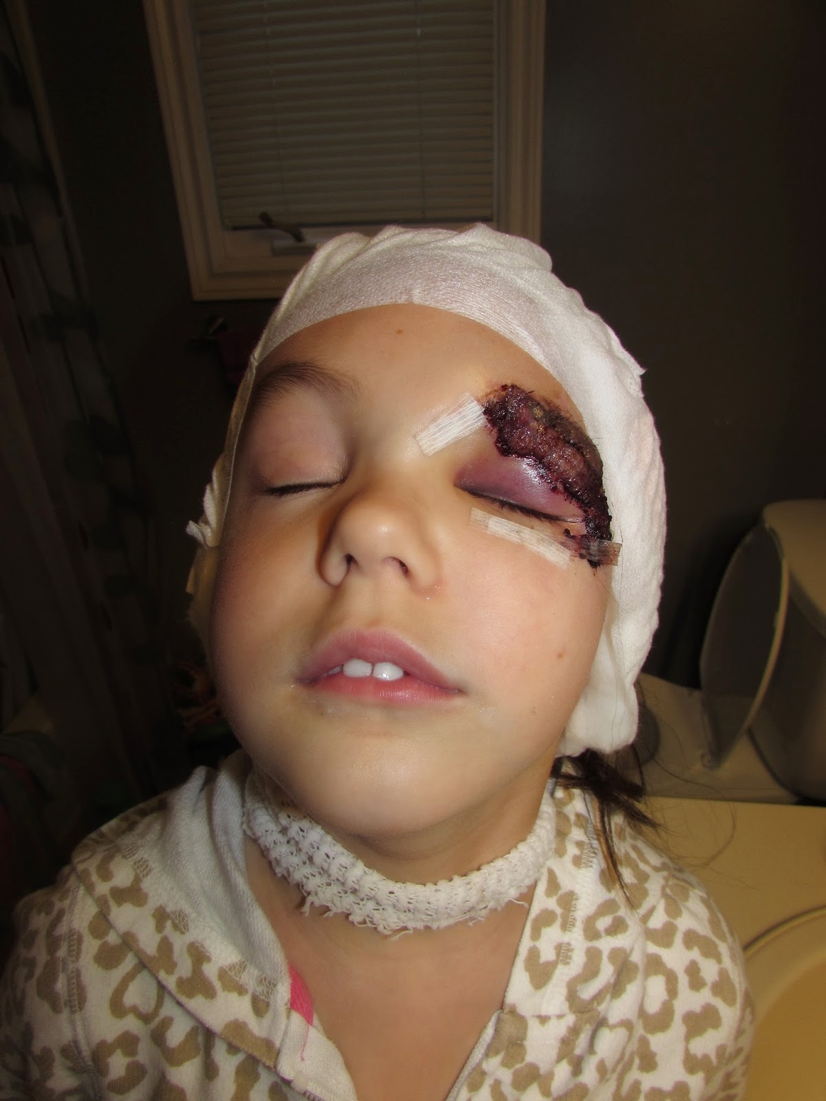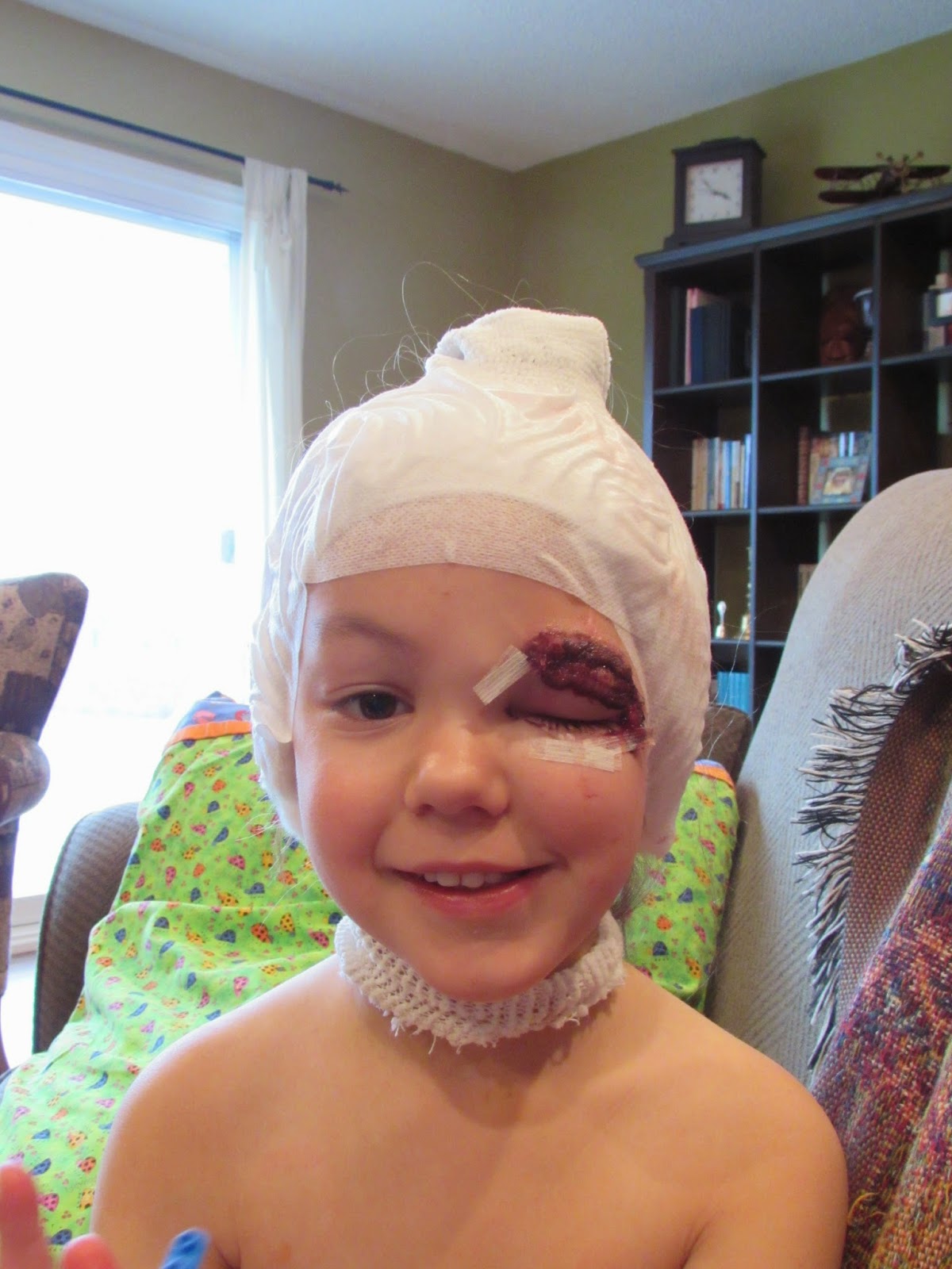 We go back to Sick Kids for 7 am Tuesday morning, for Dr. Zuker to take off all the gauze under her eyebrow (you can't really see the gauze as it is all bloody and stuff...), the steri-strips under her eye, as well as her head wrap. She will be put out for all this. We pray that the skin grafts have taken by then and that the healing continues.