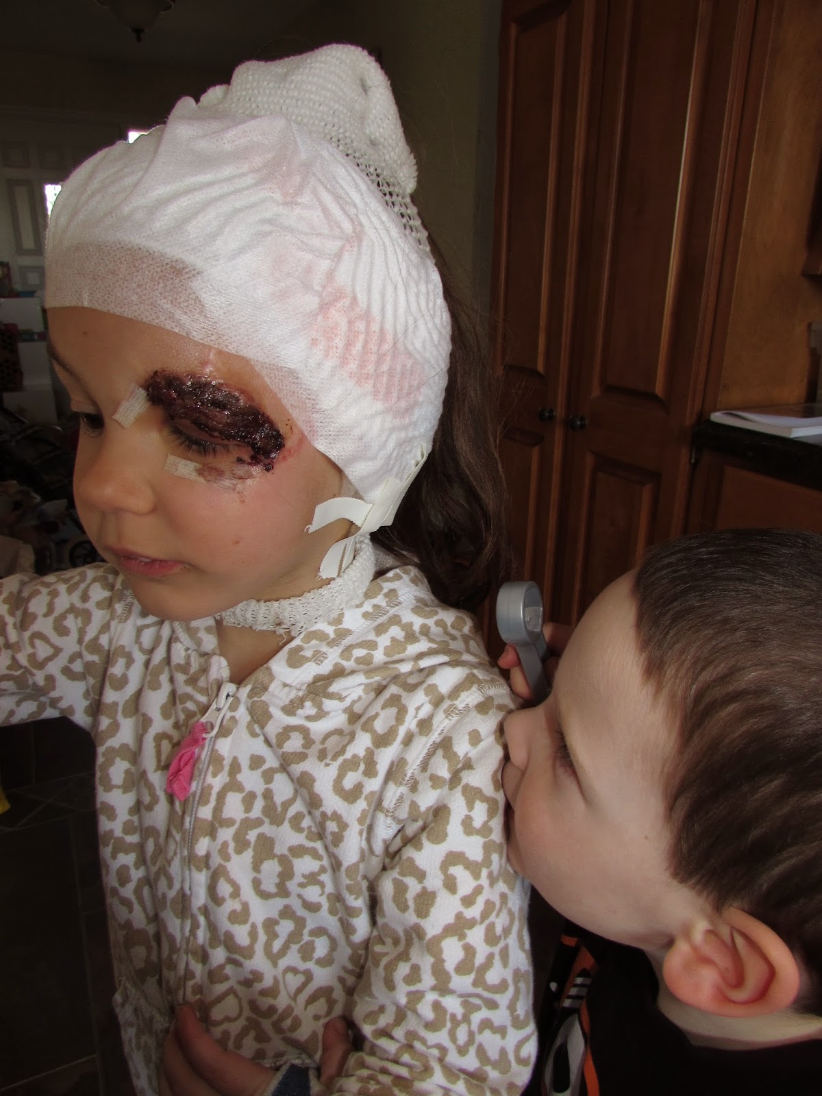 The skin grafts came off her ear, and to keep that incision sealed, she goes to bed with a sweatband around her head, so her ear won't fold over as she sleeps and rolls around: