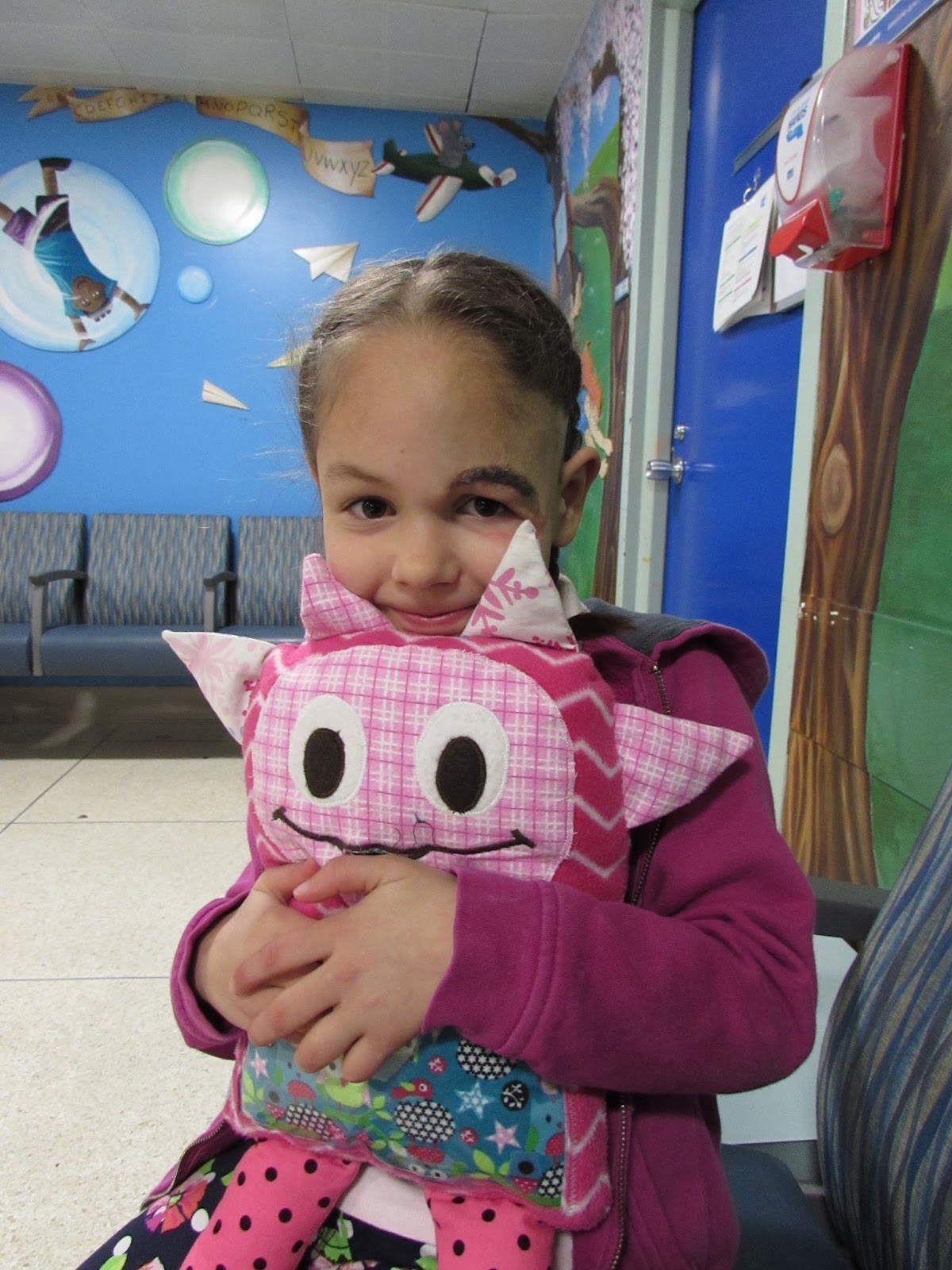 So off we went to a 2:30 appointment. Keziah was pretty excited to go back to the hosptial, taking her new Bravery Bead Buddy with her. This stuffie was made for her by a high school class in Toronto. She was "nominated" by someone for one to be made for her, and Keziah loves it! All her bravery beads can be fed through the mouth and there is a window pocket for a stomach where you can see all the beads. She hasn't used it for that though - just for snuggling so far :)