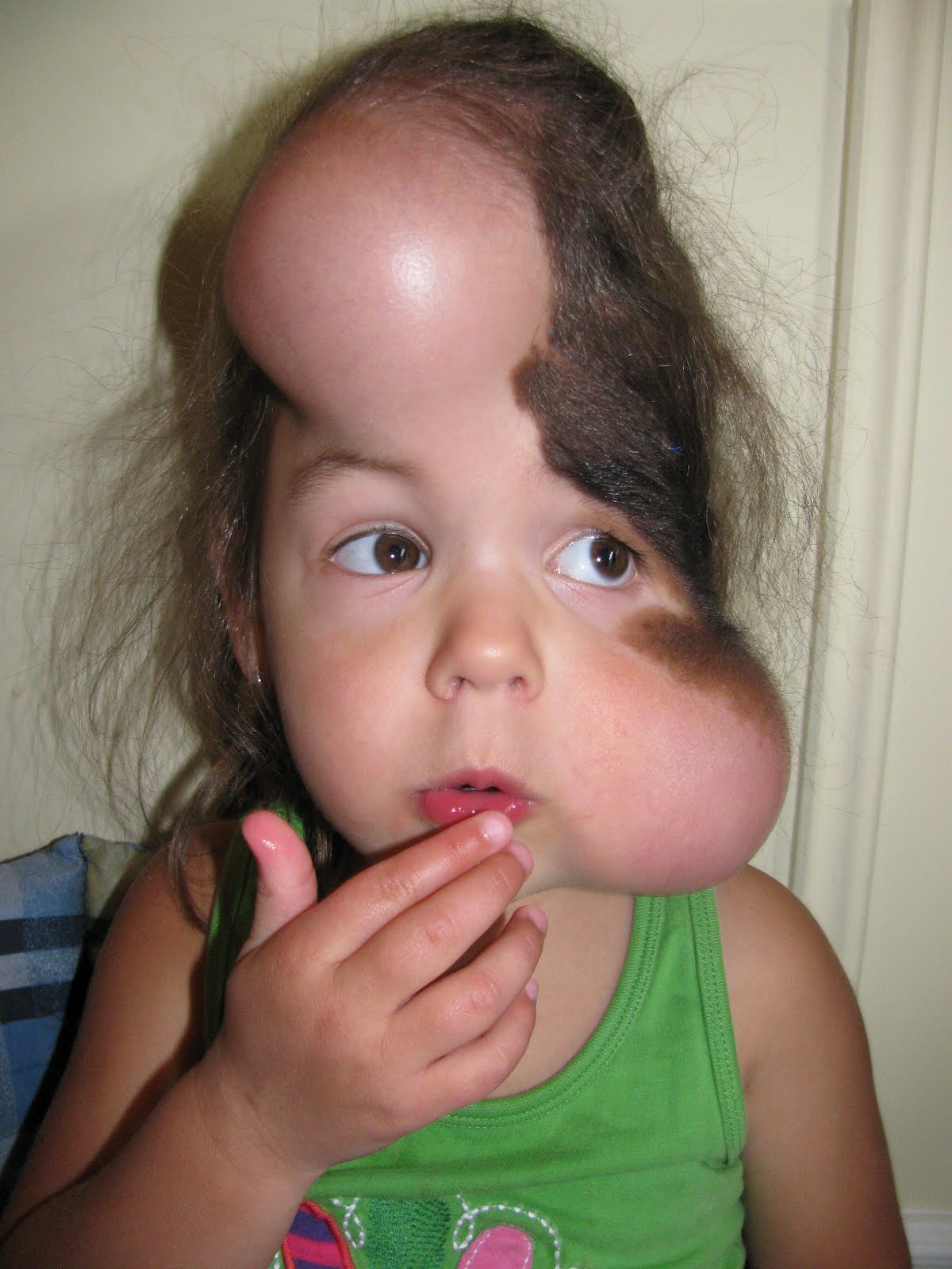 Although her cheek and forehead have changed a lot, that smile and brown eyes sure haven't! She is still as spunky as ever, which surprises many people when they see her hopping and skipping around. It looks painful but overall, it really has not bothered her much at all.
